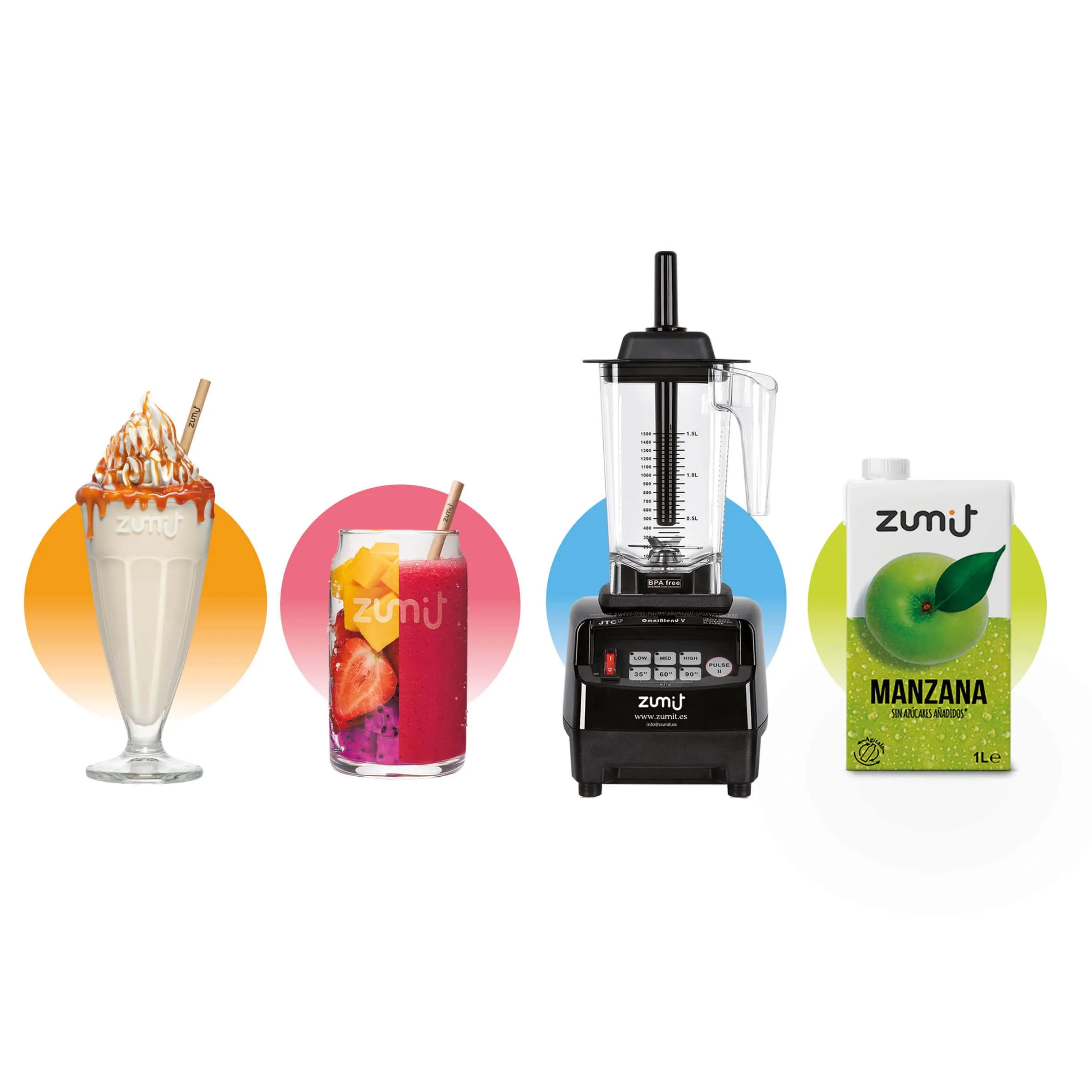 La preparación de smoothies en bares es muy simple: solo necesitas mezclar 250ml de nuestro zumo base de manzana, verter la bolsa de monodosis Zumit y triturar 30 segundos. No se requiere formación.